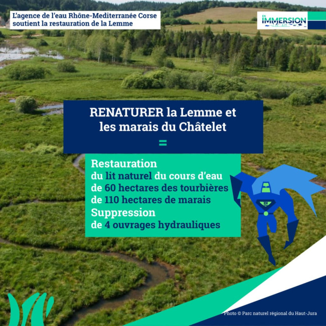 - Restauration de la Lemme dans son état sauvage sur un linéaire total de 5 km et des tourbières du marais du Châtelet sur une étendue de 60 hectares.